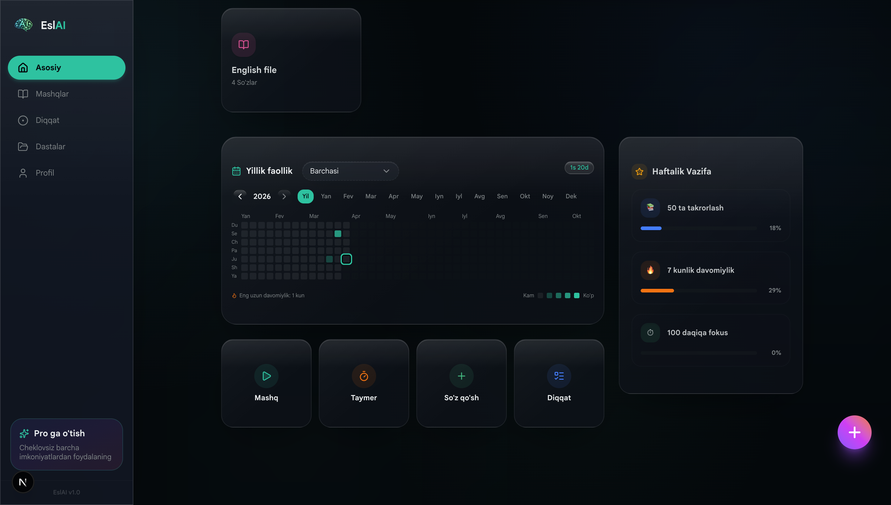Heatmap, haftalik vazifalar, davomiylik — barchasi ko'z oldingizda.